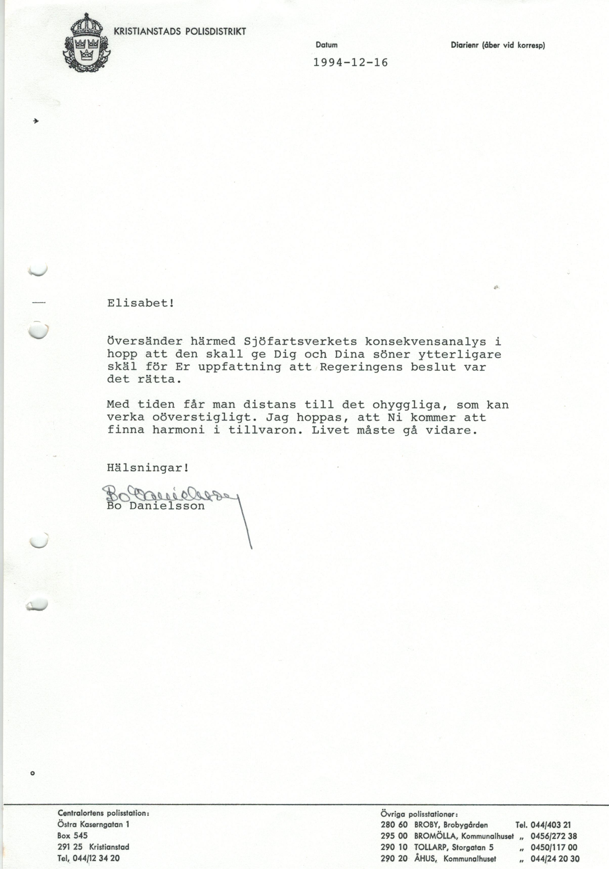 Samma dag blir mina söner och jag kallade till polishuset i Kristianstad, tillsammans med anhöriga till ytterligare fyra omkomna i vårt län. Vi förstod inte vad vi skulle där och göra eftersom vi redan visste att det inte blev någon bärgning.