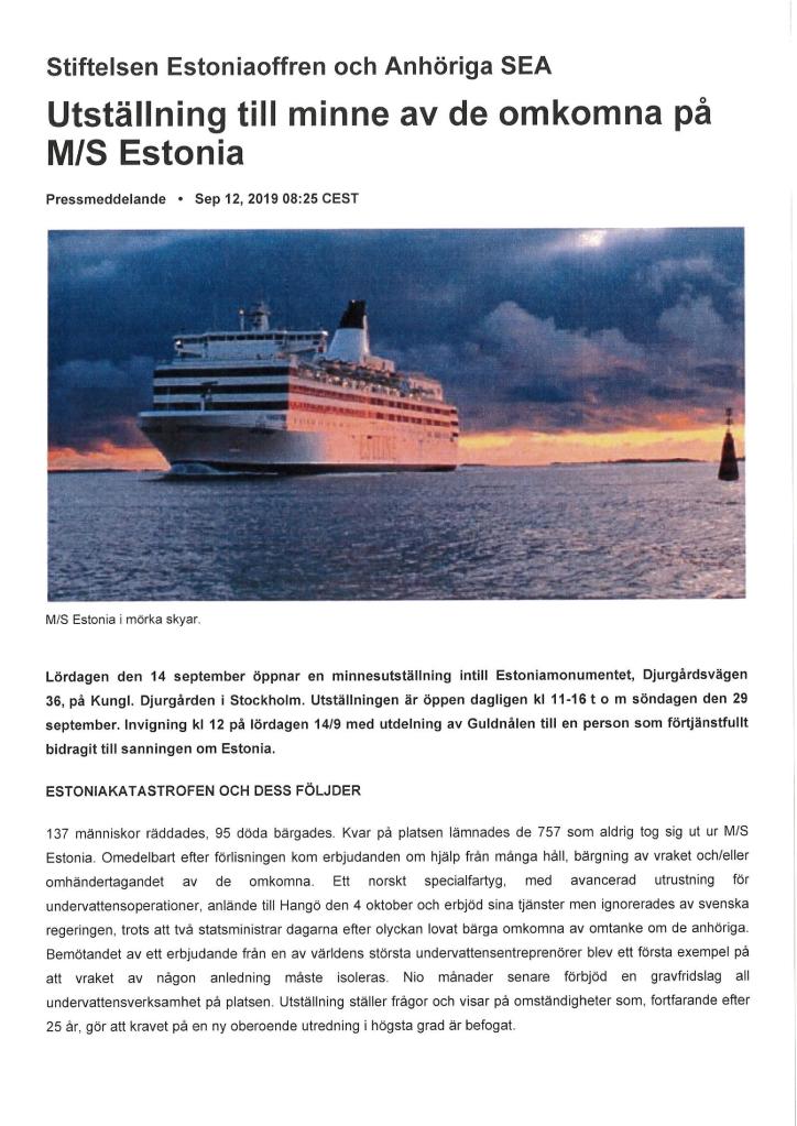 Idag lördag den 14 september öppnar SEA – Stiftelsen Estoniaoffren och Anhöriga en minnesutställning vid Estoniamonumentet intill Galärkyrkogården på Djurgården i Stockholm.