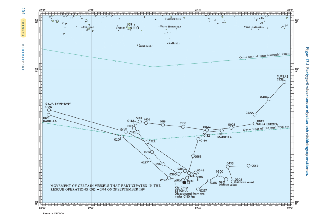 I ”Haveriutredningen” JAIC:s slutrapport på sidan 206 finns plottar för Silja Symphony, Isabella, Silja Europa, Mariella, Tursas. Även några inte namngivna fartyg (se längst ner i högra hörnet på bilden).