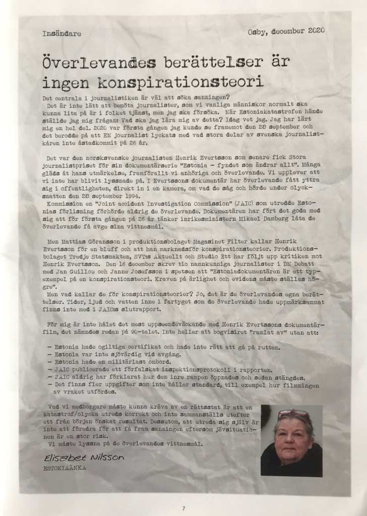 Här kommer reportaget där även överlevaren Anders Eriksson berättar att de aldrig blivit hörda. Redan den 15 januari 1999 skrev 27 överlevande ett brev till Mona Sahlin. Något svar fick de aldrig.