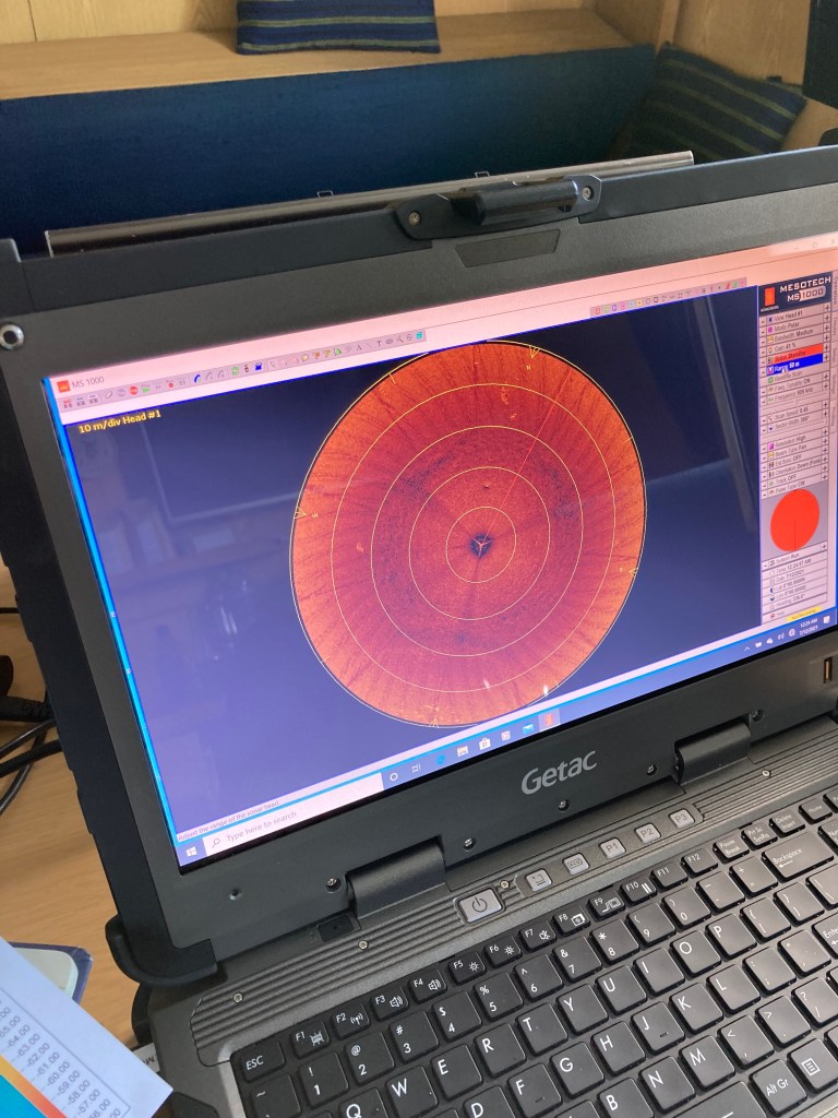 Hej! Här kommer lite enkla bilder från mobilen, från fm test dyk med Mesotech. Det finns en skiss över placeringar.? Den kommer bli tätare, speciellt i fören. Dessa punkter på skissen är att ses som referenser och är inmätta på några centimeter när. Vädret är gynnsamt så vi kör nu i tre dagar. Strax ska de skarpa mätningarna börja.
